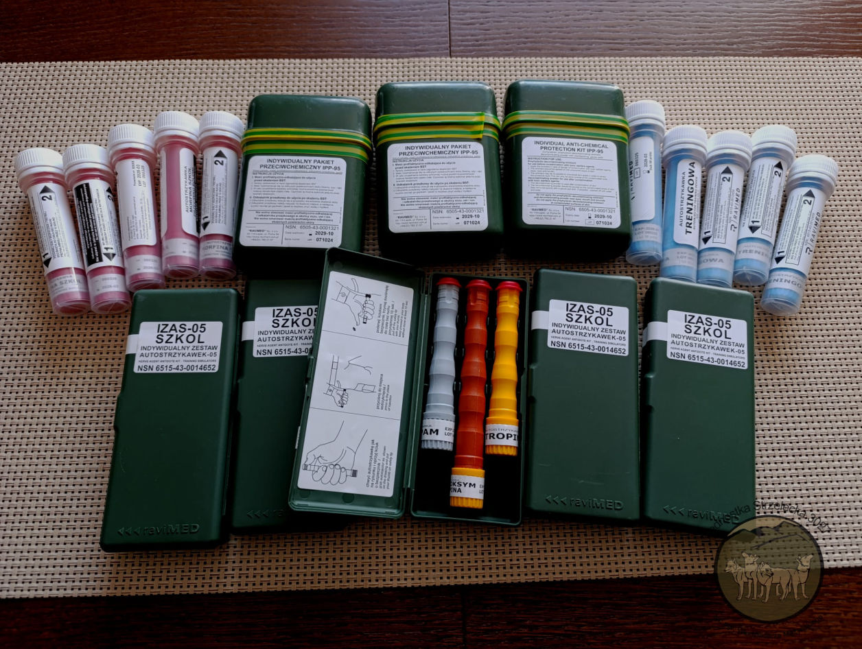 Firma RAVIMED przekazała nam sporą ilość sprzętu treningowego, używanego podczas ćwiczeń z zakresu obrony przeciwko CBRN (zagrożeniom chemicznym, biologicznym, radiacyjnym i nuklearnym). Otrzymaliśmy pakiety IPP-95, szkoleniowe zestawy IZAS-05, oraz szkoleniowe autostrzykawki.